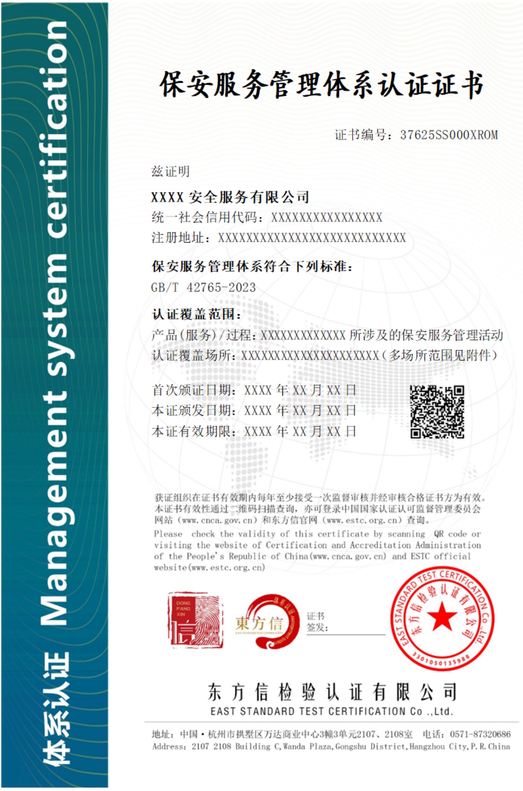 本规则适用于规范东方信检验认证有限公司(以下简称“东方信/ESTC”)开展保安服务管理体系(SSMS)认证活动。