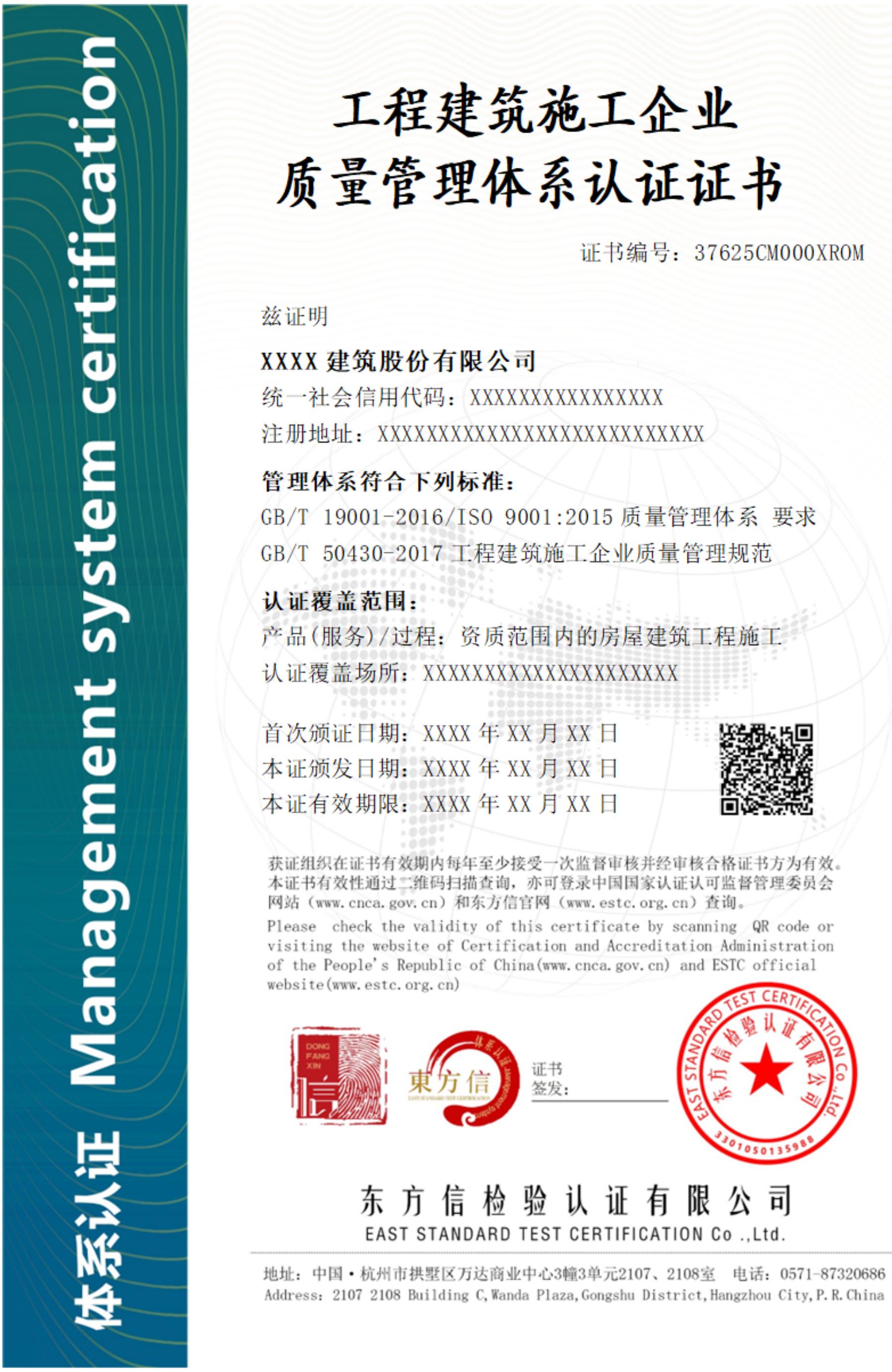 本规则适用于规范东方信检验认证有限公司(以下简称“东方信/ESTC”)开展建筑施工企业质量管理体系认证活动。